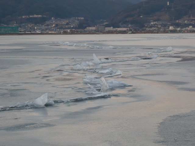 ところで、見に来ている人は年配の人たちが多いのかと思いきや、20~30歳代のサラリーマンがスーツ姿でケータイで撮っていたり、大学生らしき10人くらいの男女のグループが御神渡りをバックに撮っていたり…